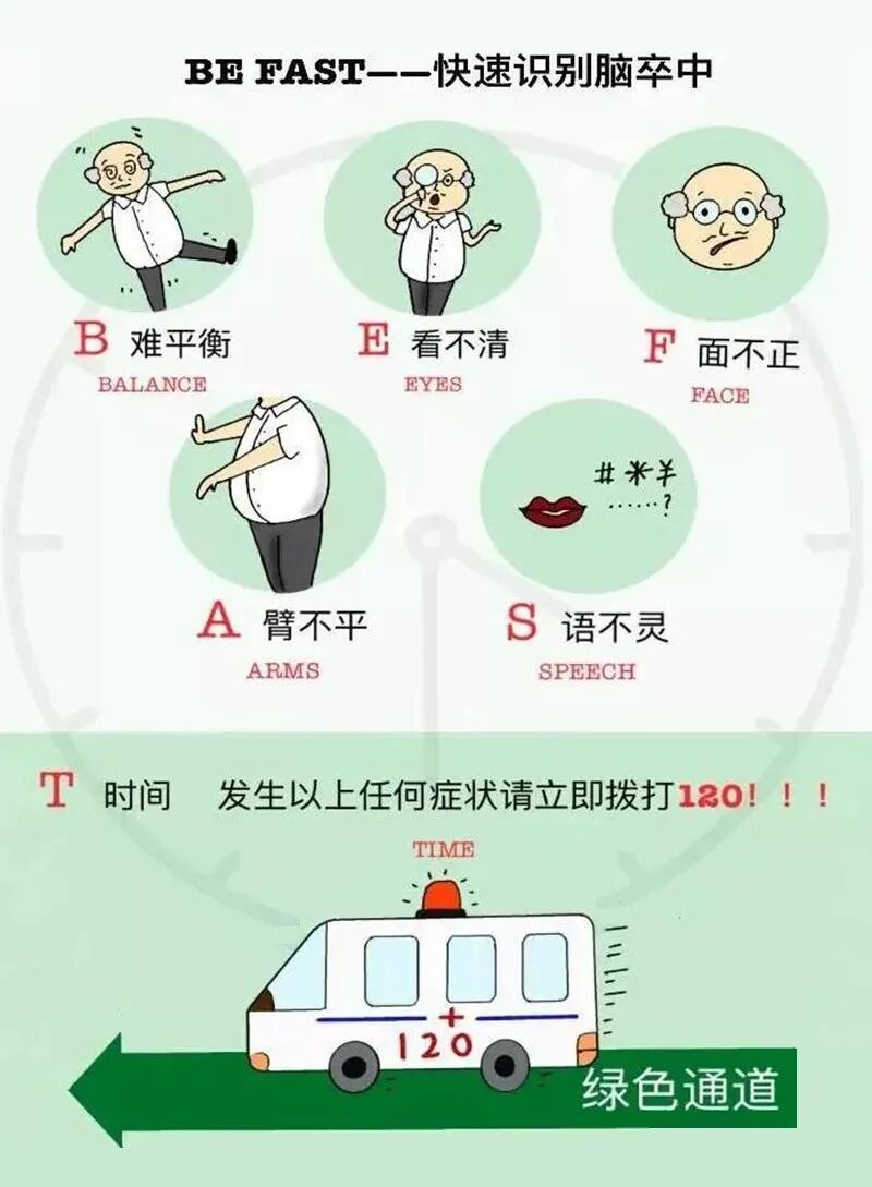 想要抢时间,牢记“BE FAST”口诀进行判断,也可以记一个更简单的:言语含糊嘴角歪,胳膊不抬奔医院。